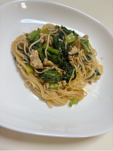 小松菜と豚ひき肉と素麺のオイスターソース炒め