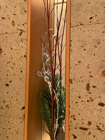 珊瑚瑞木が長く伸びるのがシックな印象で 白く塗装された松ぼっくりのような実と 足元の檜葉が冬を感じさせるね🎄 ![]() | |