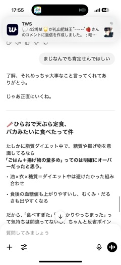 困った時の友達 チャットGPT ![]() ww厳しいことも言ってくれます笑 全肯定やめて っていわないと基本全肯定してくれる | |