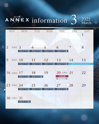 みくです ![]() お疲れ様です ![]() 出勤しましたっ ![]() 2月最終日~ ![]() 週末ですよ、皆さんご来店待ちしております ![]() CLUB ANNEX みく ![]() ┈┈┈┈┈┈┈┈┈┈ ✴︎セット料金✴︎ ⚫︎フリードリンク 20:00~20:29 (60分)4,000円(税込) 20:30~20:59 (60分)5,000円(税込) 21:00~LAST (60分)6,000円(税込) ⚫︎ ボトルキープ20:00~20:29 (90分)4,000円(税込) 20:30~20:59 (90分)5,000円(税込) 21:00~LAST (90分)6,000円(税込) ※初回セットのお客様30分サービス ※延長以降は通常セット料金 ※お連れ様がハウスボトル注文時は別途料金 ※ボトルの持込不可 ⚫︎ 追加フリードリンクチャージ(90分)初回セットのみ 1,000円 ┈┈┈┈┈┈┈┈┈┈ 延長 (60分) 6,000円(税込) (30分) 3,000円 (税込) ┈┈┈┈┈┈┈┈┈┈ 指名料 (本指名・場内指名) 1,000円(税込) 同伴料 2,000円(税込) シングルチャージ 1,000円(税込) サービス料 20%(税込) ┈┈┈┈┈┈┈┈┈┈ freedrink ビール・ウイスキー・ブランデー 焼酎(麦.芋.米) ソフトドリンク(コーラ.ジンジャエール.オレンジジュース.ウーロン.緑茶.炭酸) ┈┈┈┈┈┈┈┈┈┈ CLUB ANNEX 福岡市南区大橋1-14-1 グランマーサー大橋2F TEL.092-553-3434 | |