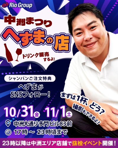 | こんにちは‼️へずまりゅうです😊 来週10月31日(金)と11月1日(土)は福岡の中洲で中洲まつりというイベントに参加します!!🍻🏮 ![]() 毎年、へずまのお店と言う屋台を開いてるので、良かったら遊びに来てください🤗 シャンパン&テキーラ沢山買ってくださいね🥳 | |