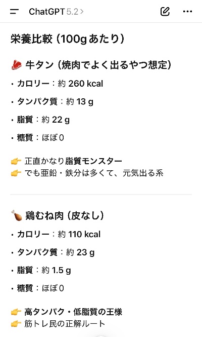 今タン食べてたから ふいにChatGPTにタンパク質量と脂質量聞いてみたら ![]() まさかのタンは脂質モンスターでした😐💦 勝手に脂質少なめて思い込んでた 低脂質高タンパクはやっぱ鶏肉様ですね🐣 気をつけます( ᐢ ᵕ ᐢ )✌︎ エスケープ 犬愛ナホ | |