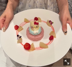 スペシャルデザート🍰 下のピんくのところは桃🍑味でサラが大好きなお味でした!!✨ にしても羽キティ🪽可愛すぎか❤︎ | |