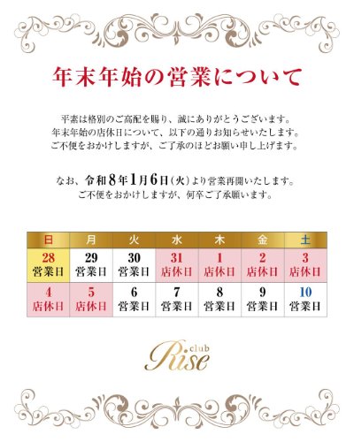 こんばんは 年末年始 RISE営業日のお知らせです ![]() 2025年大変お世話になりました 盛大に感謝申し上げます🙏✨️ 良いお年をお迎え下さい | |