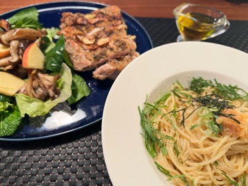 | 今日は チキンハーブガーリックステーキ きのこと林檎のホットサラダ 明太子と青シソのパスタを作りました ![]() お酒が進みそうです ![]() | |