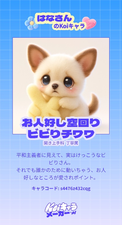いつも見てくれてありがとうございます️️꙳⟡ いま、koiキャラ診断が 流行ってるみたいです( ´-`).。oO 私はチワワでした🐶 ![]() 実はっていうか結構なビビりを 当てられてびっくり( °_° ) みなさんもやってみてください🧏🏻♀️ はな🌼🤍 | |