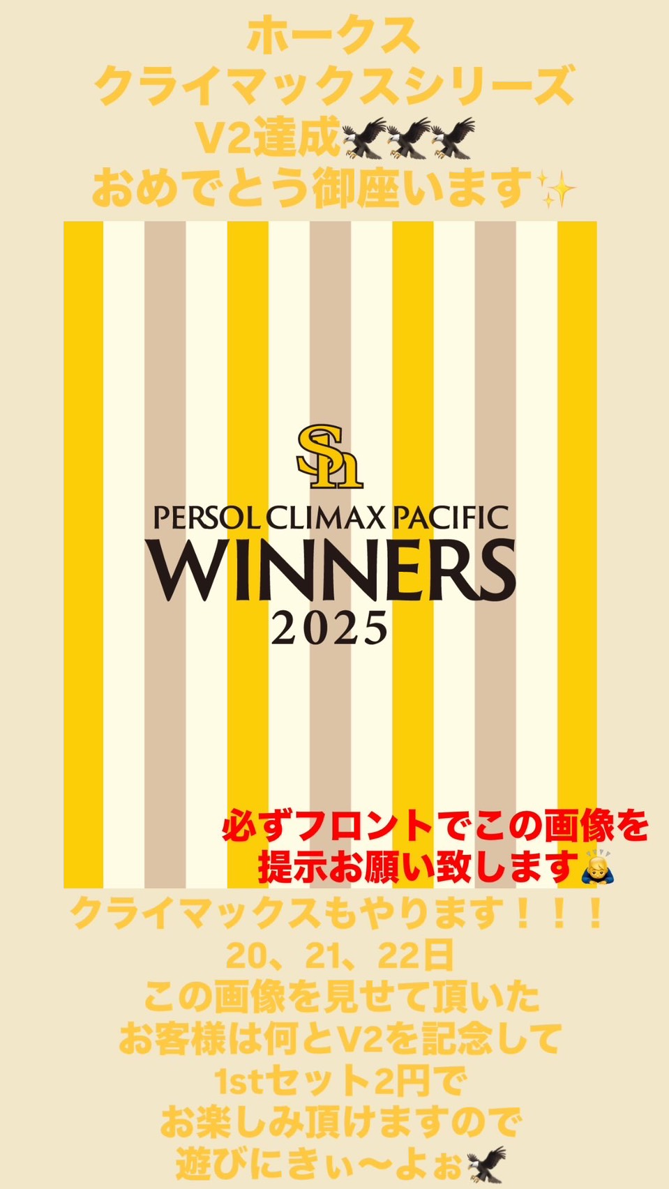 ![]() ホークス優勝しましたねっ🏆 またまたゲリライベント‼️ 今日から水曜まで‼️ セット料金 円です!下の画像をフロントでご提示ください ![]() ![]() 一緒にお祝いしましょ✨️ | |