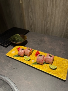 ![]() しめのご飯ものがでてきたのですが、 なんと肉寿司でした!! そして中には蟹が入ってた!😳 私は蟹は嫌いなんだけど、食べてみると食べれちゃいました、、あれ?笑 何年かぶりでずっと避けてたから食べれてびっくりです笑笑 | |