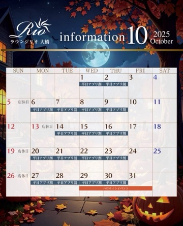 10月のカレンダーです! ![]() ハロウィンイベントもあります✨ ![]() 今日は私用でおやすみもらってます🙇♀️ 明日からよろしくお願いしますー! | |